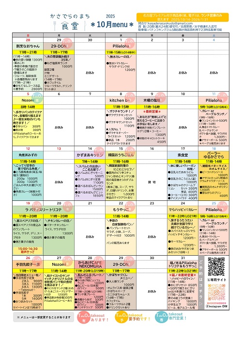 2019年5月1日に名鉄本笠寺駅前に誕生したシェアキッチン方式による食堂「かさでらのまち食堂」(南区前浜通7-32-2)の最新menuカレンダーです。予約はこちら→