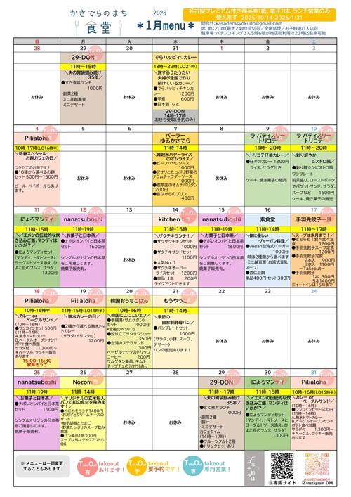 2019年5月1日に名鉄本笠寺駅前に誕生したシェアキッチン方式による食堂「かさでらのまち食堂」(南区前浜通7-32-2)の最新menuカレンダーです。予約はこちら→