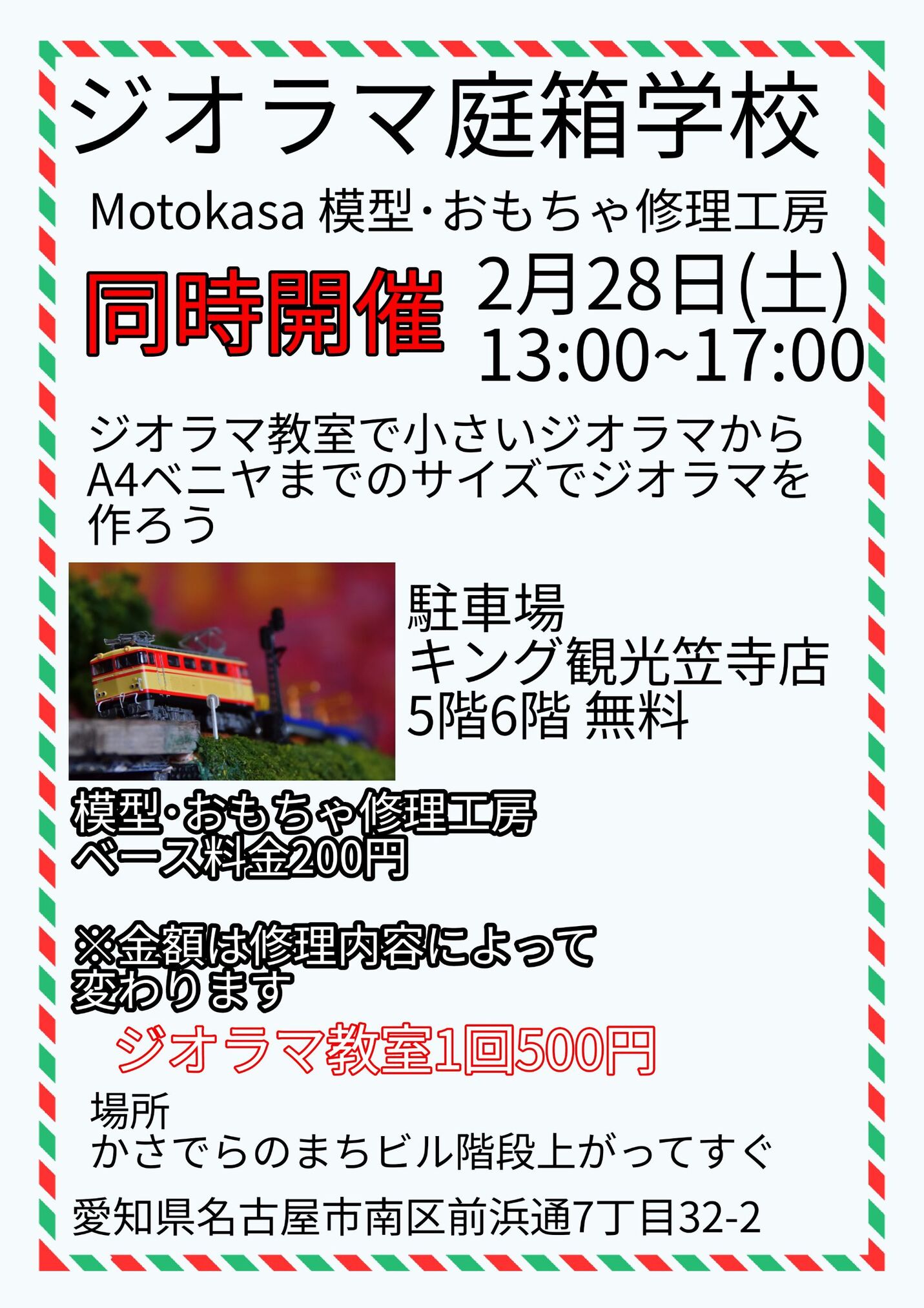 2026年2月28日(土)に再開する、ジオラマ箱庭学校のチラシです。