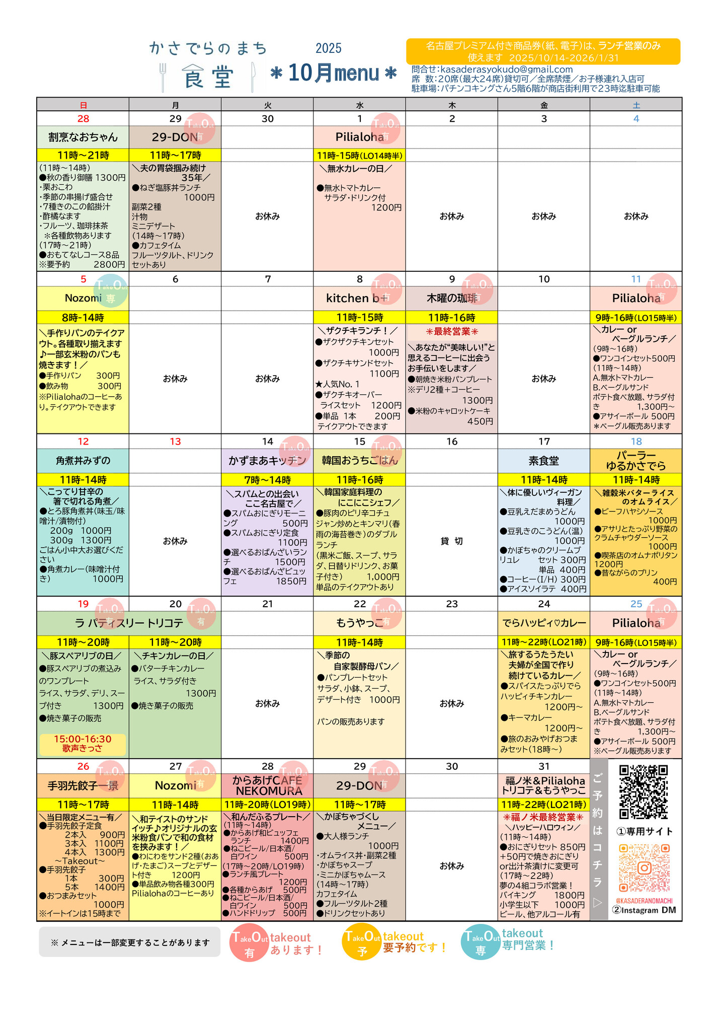 名鉄本笠寺駅前かさでらのまち食堂の2025年10月のメニューカレンダーです。