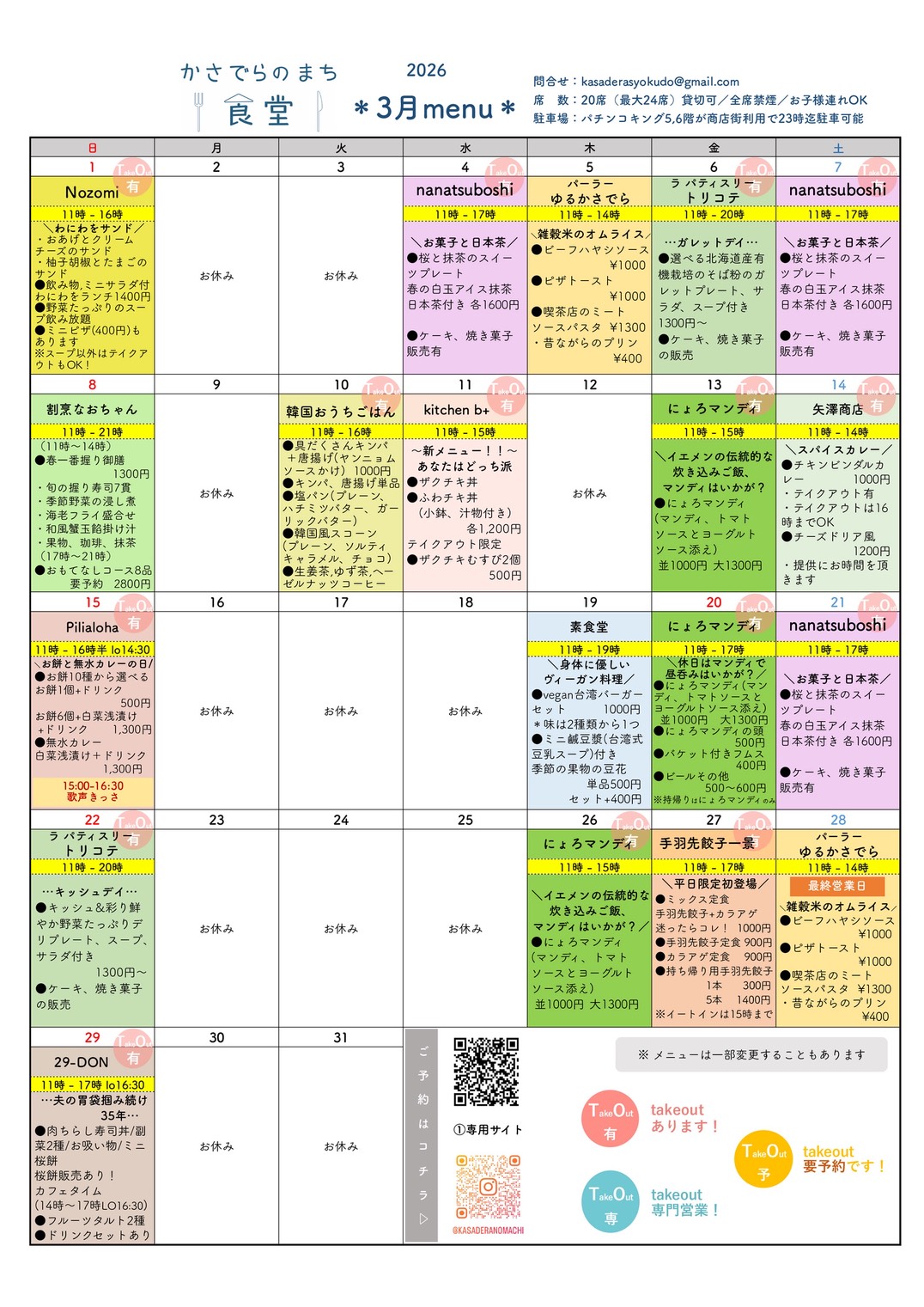 名鉄本笠寺駅前日替わりシェフの店「かさでらのまち食堂」の2026年3月のメニューカレンダーです。
