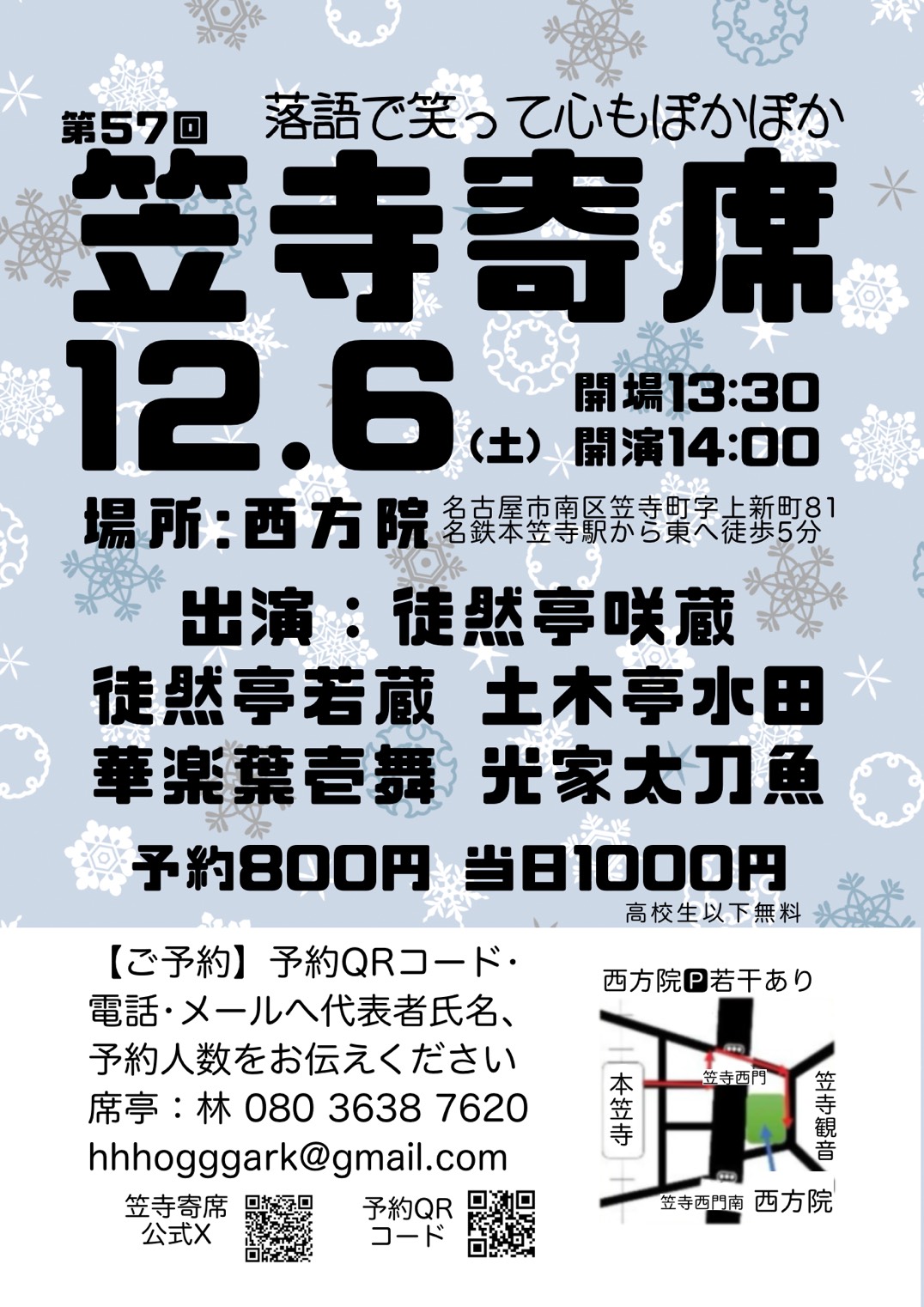 2025年12月6日(土)に西方院本堂(南区笠寺町上新町81)で開催する、第57回笠寺寄席のチラシです。