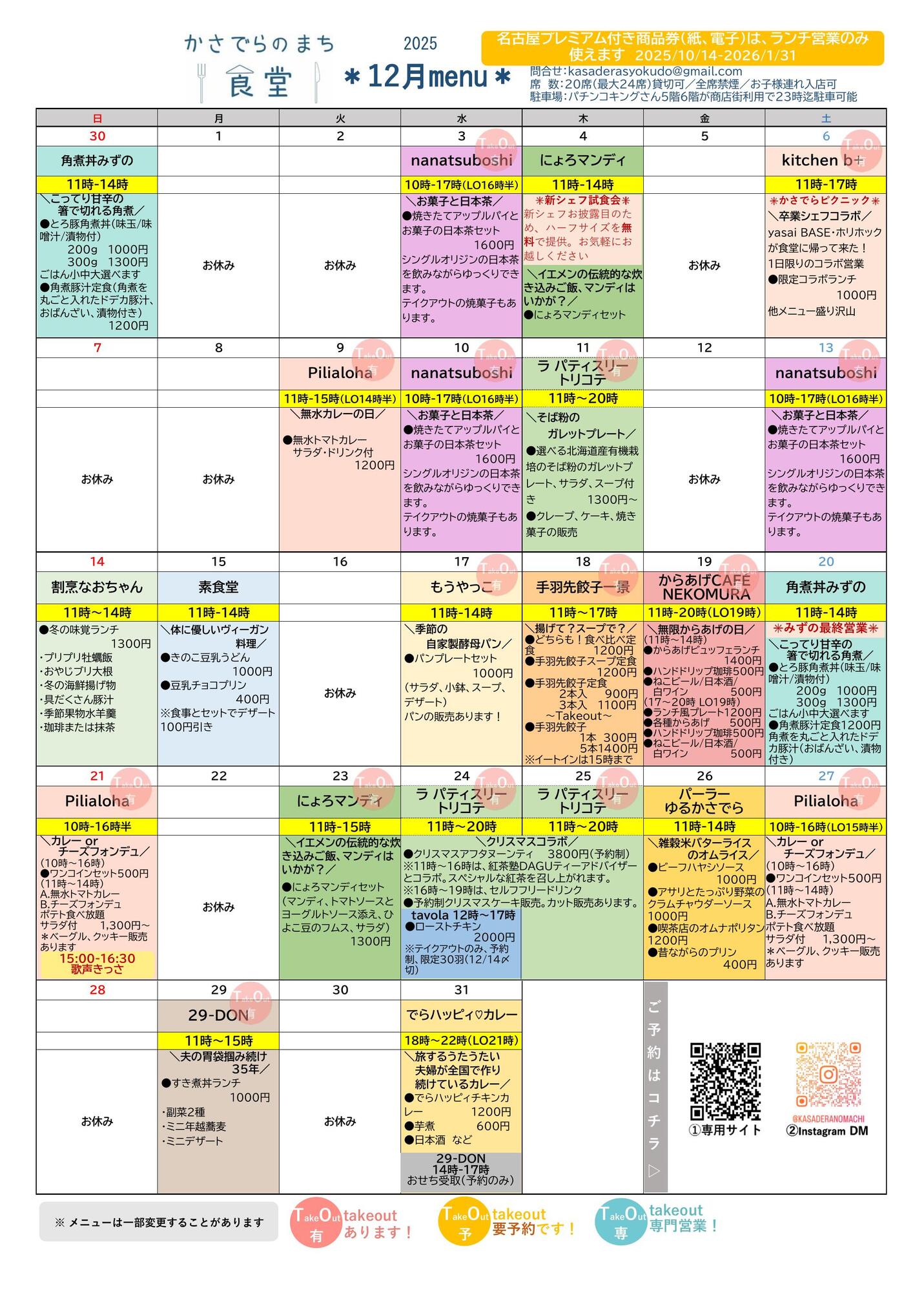 名鉄本笠寺駅前かさでらのまち食堂の2025年12月のメニューカレンダーです。